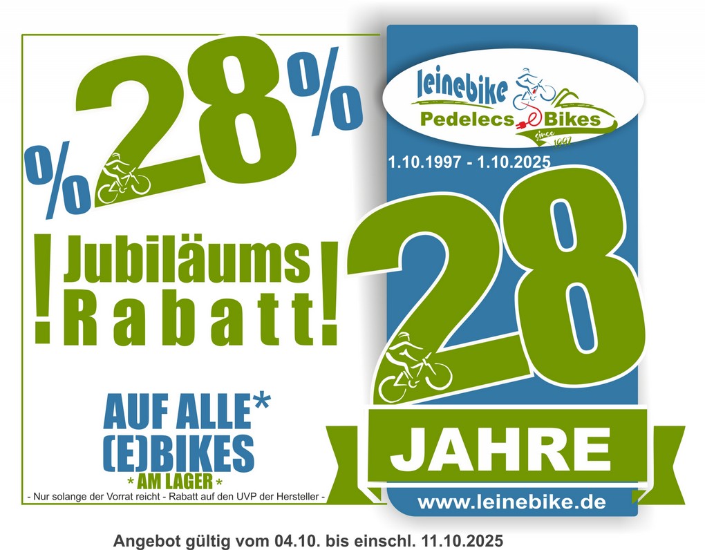 „Kaum zu glauben, weit mehr als ein „Vierteljahrhundert“;blicken Christa Brunotte-Fricke & Thomas Fricke zurück, denn ihr Fachgeschäft - leinebike - in der Gronauer Bahnhofstraße feiert Jubiläum!Das Motto „Freude am Fahrradfahren“ zieht sich seit 1997 wie ein roter Faden durch die Geschichte des Unternehmens, das auch über die Grenzen Gronaus hinaus für seine hohe Qualität und Zuverlässigkeit geschätzt wird.Seit dem 1. Oktober 2025 sind es bereits 28 erfolgreiche Jahre. Dieses Jubiläum soll auch für die längjährigen Kunden ein Ereignis sein, es gibt in der Zeit vom 04.10. bis 11.10.2025, einen Jubiläumsrabatt von 28% (auf den UVP) auf ALLE (E-)Bikes am Lager!Ein Besuch lohnt sich bestimmt!
