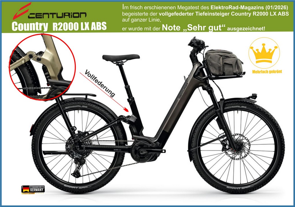 Mit Freude haben wir wahrgenommen, dass erneut ein (E)Bike unserer langjährigen Partner-Marke "CENTURION", mit der Note "Sehr gut" ausgezeichnet wurde! Das Modell Country LX ABS ist ein alltagstauglicher Tiefeinsteiger. Es zeichnet sich, wie erfahrungsgemäß bekannt, durch beste Fahreigenschaften, qualitativ hohe Ausstattungkomponenten (daher gewichtsoptimiert) aus. Dieses Modell besticht durch die verdeckt eingebaute Rahmenfederung, die den Fahrkomfort, in der Verbindung mit der Luftfedergabel abrundet. Für das bessere Händling sorgt eine absenkbare Sattelstütze. Somit läßt dieses Modell keine Wünsche offen ...