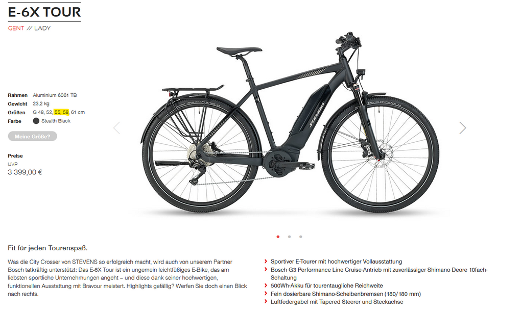 Das beliebte E-6X Tour kommt mit einem innovativen Rahmen, der über einen semi-integrierten 545 Wh-Akku verfügt. Die leichte, unaufdringliche Konstruktion und das edle Design in Stealth Black machen aus dem Rad einem echten Hingucker, das mit Tektro Volans-Scheibenbremsen, Shimano Deore/CUES-Ausstattung (10-fach) und griffigen Continental Double Fighter III-Reifen auch sonst auf ganzer Linie zu überzeugen weiß.