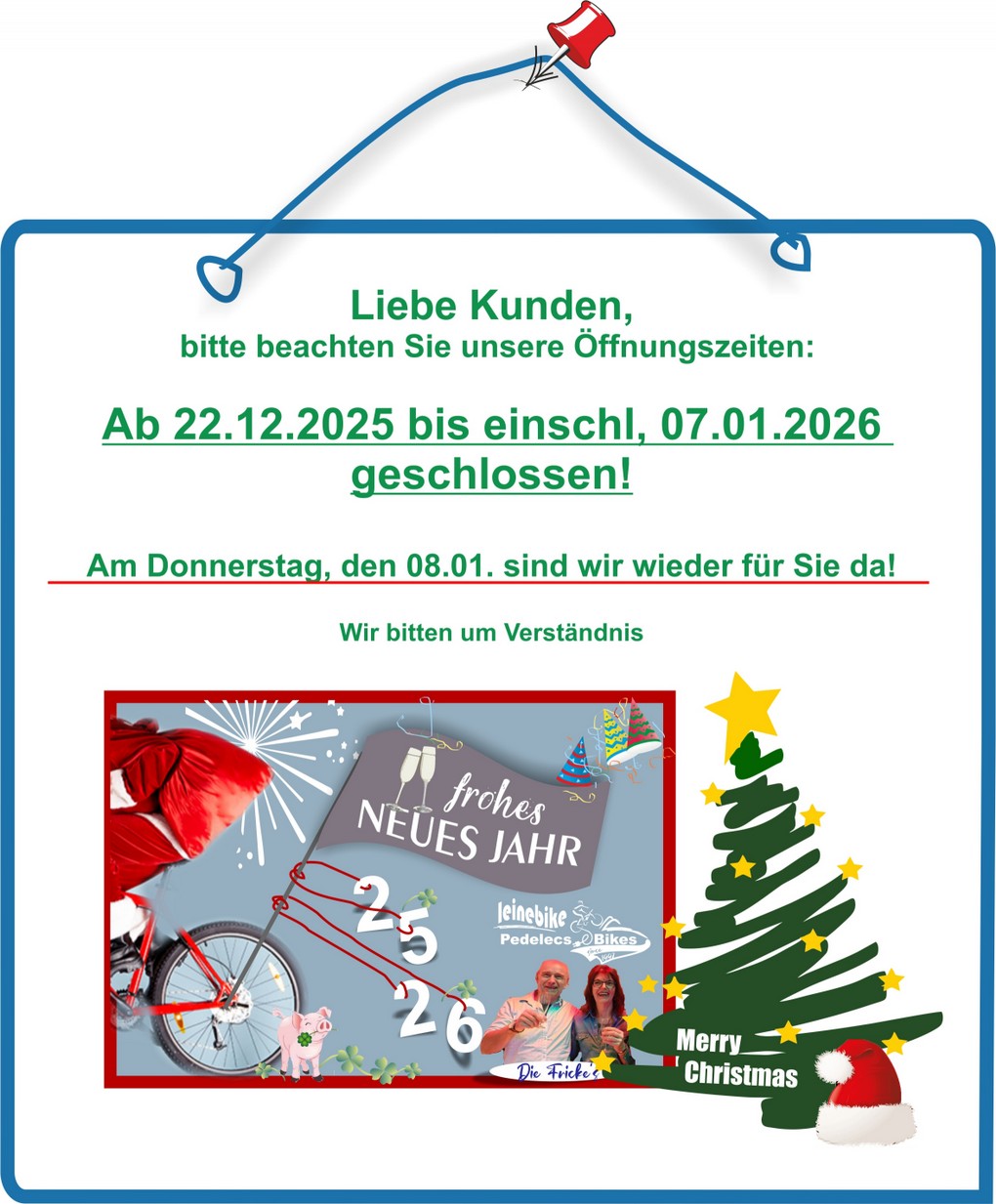 Wir nutzen die Zeit zwischen den Jahren, um unsere Inventur zu erledigen. Ab dem 08.01.2026, sind wir wie gewohnt erreichbar.